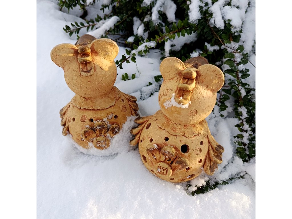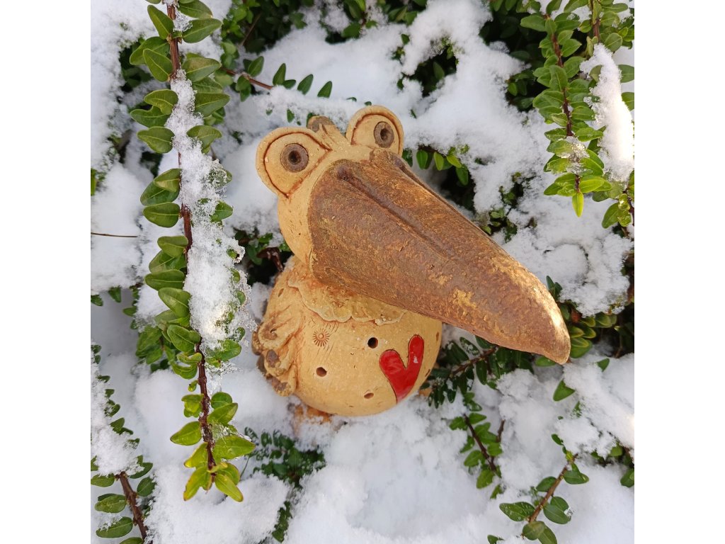 Ptakošek menší je vyroben z hrubé šamotové hlíny, dekorován patinou a detaily jsou glazovány matnou zemitou glazurou.